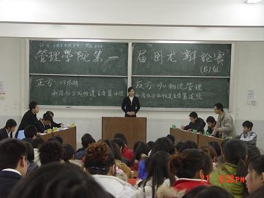 2009年12月21日晚6点30,管理学院第一届“卧龙杯”辩论赛初赛B组在4栋阶梯04精彩举行。社团联合会秘书长卓丹尼,组织部部长王腾飞,学习部副部长雷博、樊星,女生部副部长邹健担任本次比赛赛评委。