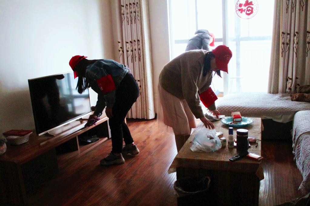 志愿者们给喻奶奶打扫卫生