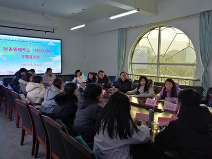 调研ACCA工作。经管学院院长朱院长、副院长王芬、财务管理系主任陈春艳、ACCA项目中心主任孙正新、ACCA项目中心副主任(班主任)邹芸螺,2023级财务管理专业ACCA方向班学生代表参加调研座谈会。