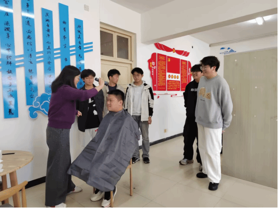 学生之间的互相理发由大家自由组队,一人操作,旁边同学围观评说,从生疏到熟练,每一个动作都倾注着认真与专注。在同学们鼓励声中,从最初的紧张羞涩,到后来的自信满满,不仅发型变得清爽利落,彼此间的友谊也在这一推一剪中愈发深厚。